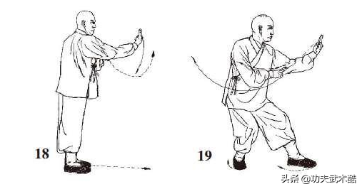 4.左脚向前(正东方)上一步,成左虚步;同时,左手剑指由下向前(正东方)上点出,高与鼻平,指尖向上,手背向前,右手护于左胁前,手心向下;目视左手(图19)。