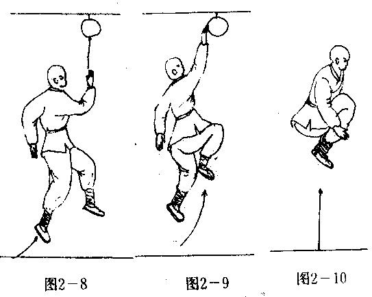 动作方法:练者腿绑铅瓦或沙袋面对横杆站立,距杆约1米处,双脚并拢,两腿自然弯屈,上体略向前倾,两臂略屈后摆(图2-20)接着利用两脚前掌猛力蹬地,两腿上弹跃起,同时两臂前L摆,跳越横杆(图2一21)。两脚前掌落地(图2一22)。照上所述方法可反复练习。