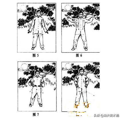 换气,两掌向下,两臂自然下垂于体两侧,指尖均向下,还原成并步直立姿势(图5)。