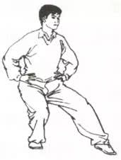 一脚向前一大步,脚尖微内扣,屈膝半蹲,大腿接近水平,膝与脚尖垂直。另一腿膝伸直,脚尖内扣向斜前方,两脚全脚着地。上体正对前方,两手抱拳于腰间,眼向前平视。